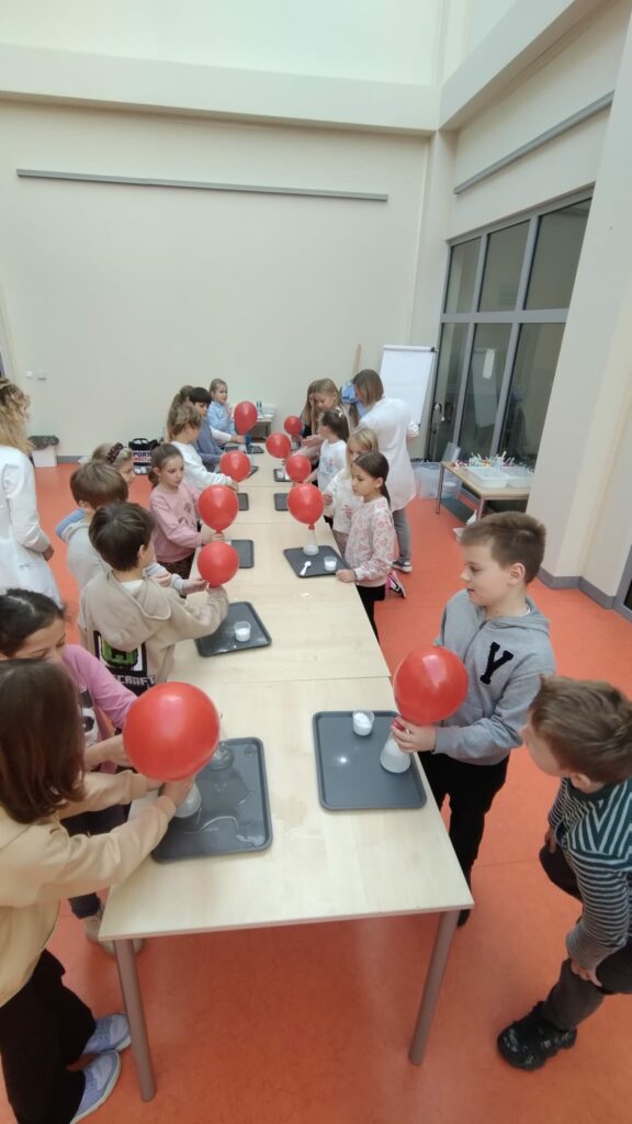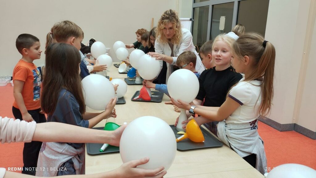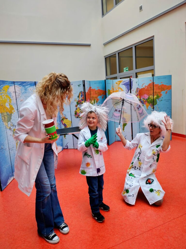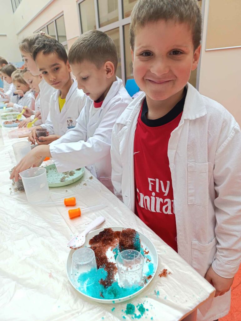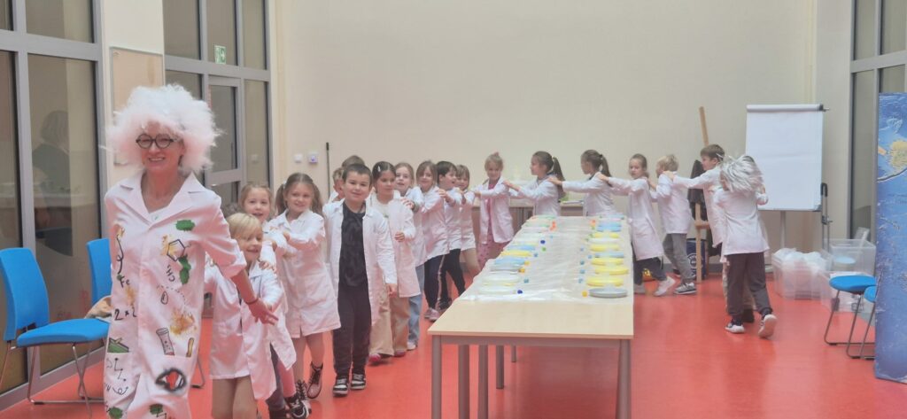 W klasach 1–3 odbyły się pierwsze spotkania z Laboratorium Radości. Podczas warsztatów dzieci wcieliły się w rolę młodych chemików – odpalały chemiczną lokomotywę, przeprowadzały doświadczenia, w których woda znikała w wyniku reakcji chemicznej, a także samodzielnie przygotowały puszyste babeczki. Poznały właściwości „magicznego proszku” i przekonały się, że nauka może być naprawdę fascynująca 🔬✨