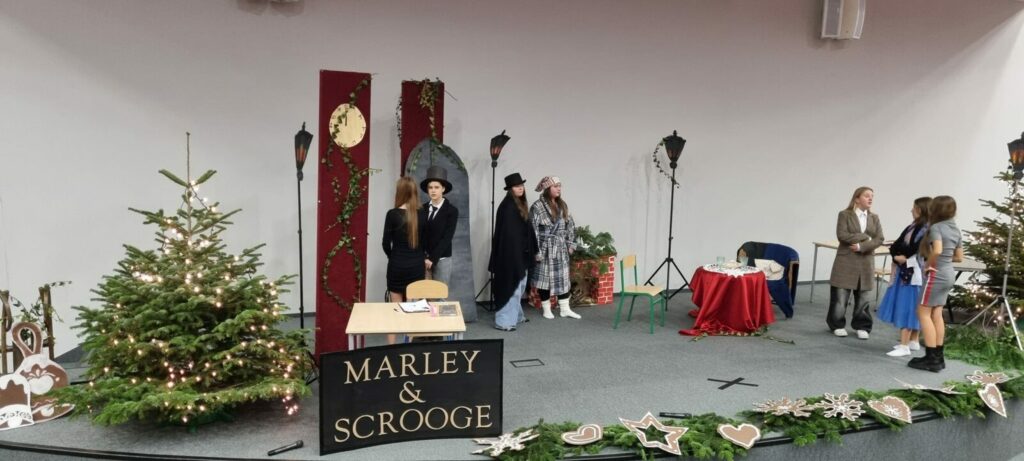 Centralną postacią spektaklu był Ebenezer Scrooge, którego przemianę uczniowie przedstawili w sposób wyraźny i przekonujący – od chłodnego, zamkniętego na ludzi skąpca po człowieka pełnego empatii i radości. Postacie duchów Wigilijnej Nocy wprowadzały na scenę element tajemnicy i refleksji, a ich obecność pomagała widzom zrozumieć sens przeżywanych przez bohatera wydarzeń. Równie ważne były role drugoplanowe, które budowały tło społeczne i rodzinne opowieści.