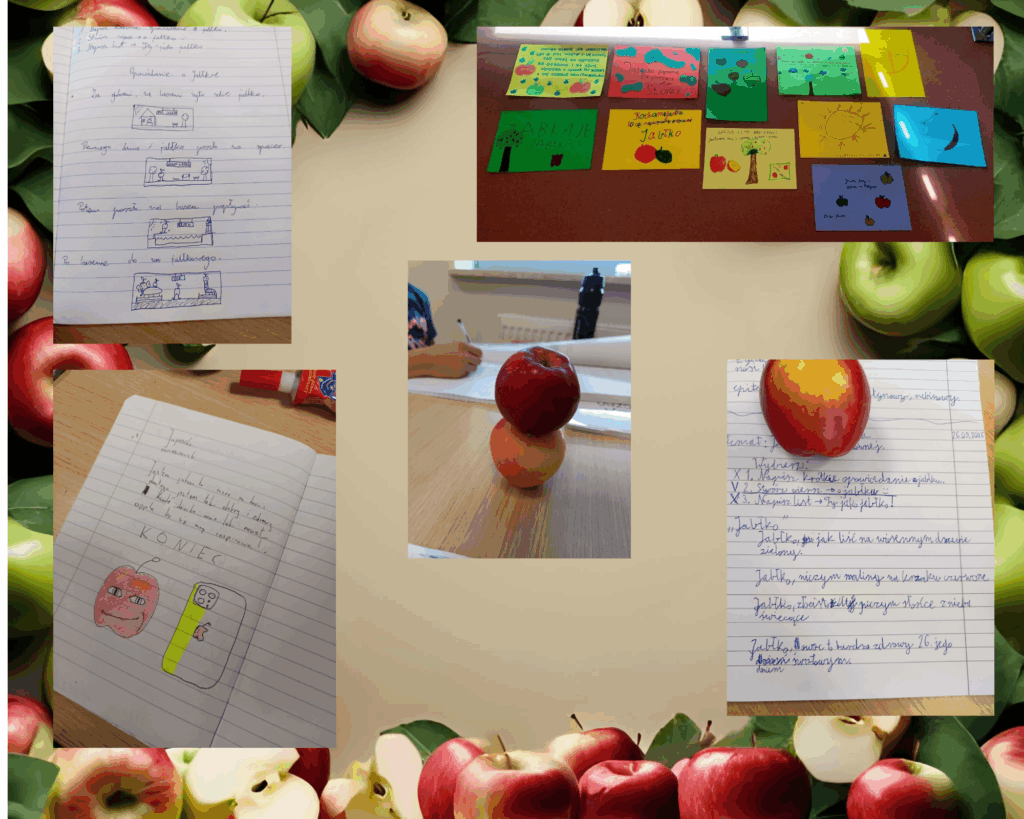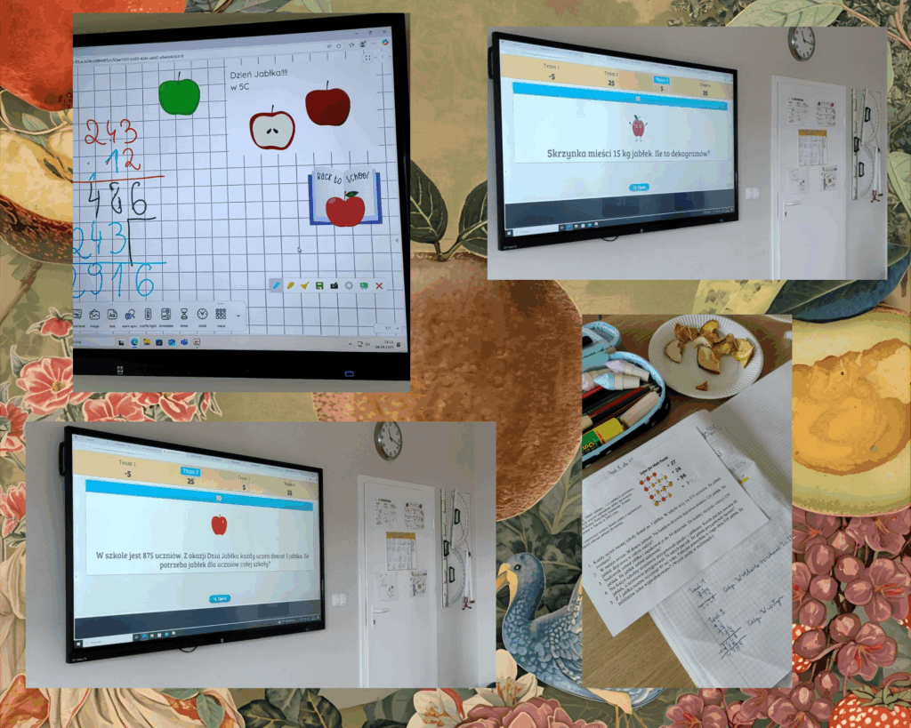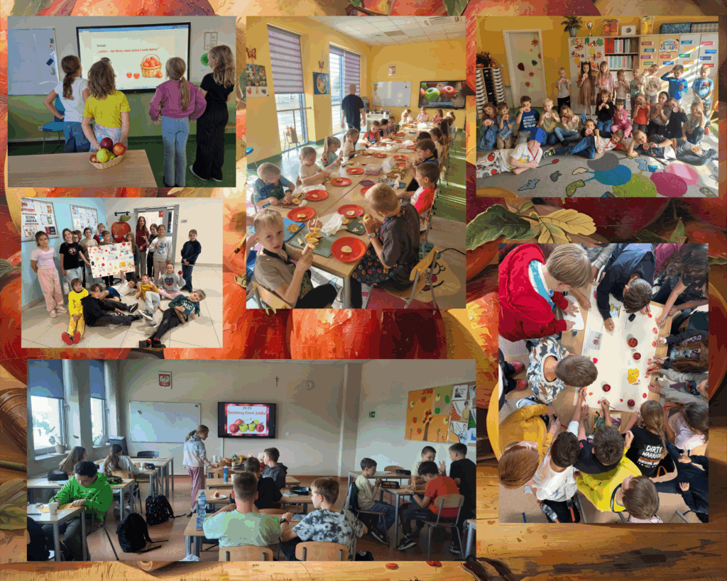 Nie zabrakło matematyki na jabłkach, religii z jabłkiem w tle ani twórczości literackiej – od wierszy, rymów, haseł reklamowych aż po opowiadania z jabłkiem w roli głównej. Było też wyjątkowo – nasi siódmoklasiści upiekli szarlotkę i poczęstowali nią niezwykłych gości – koszykarzy na wózkach, którzy dzień wcześniej dzielili się swoją pasją z uczniami.