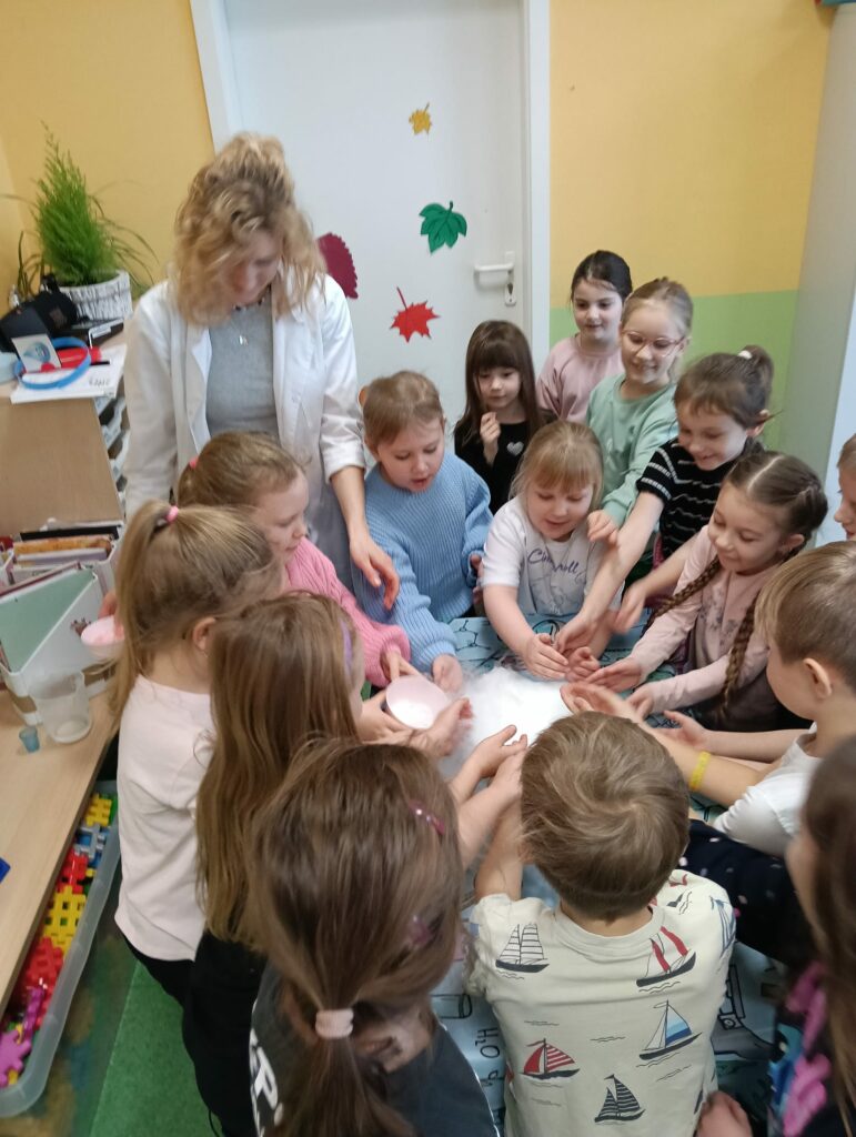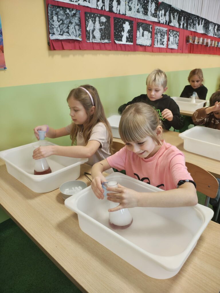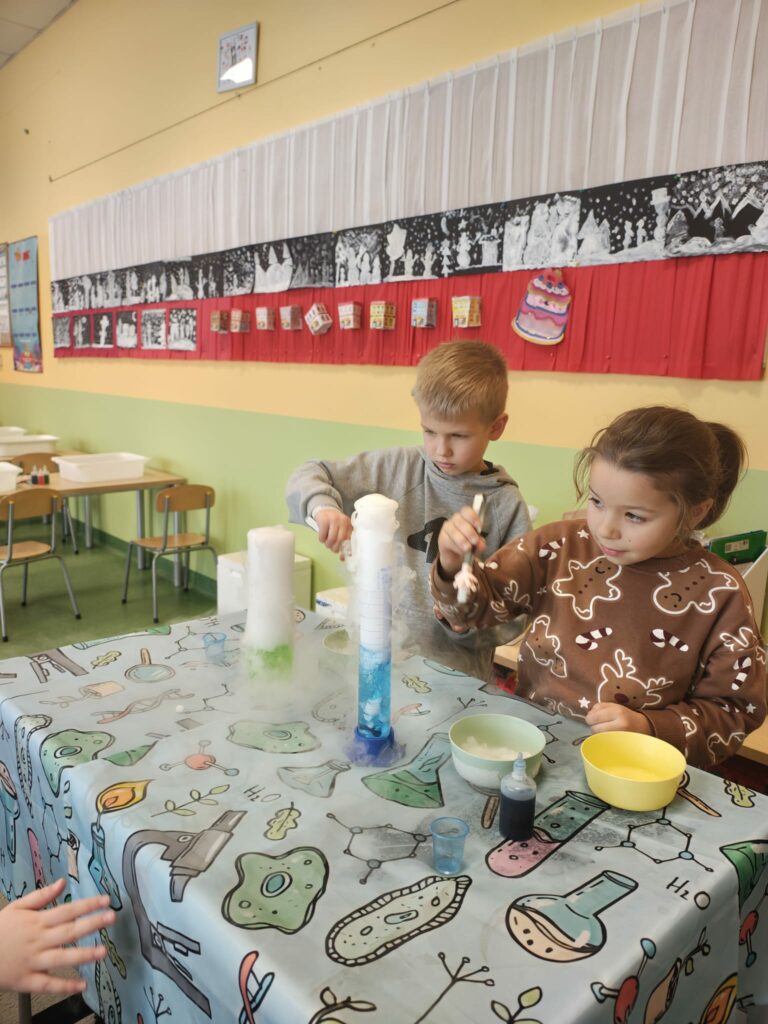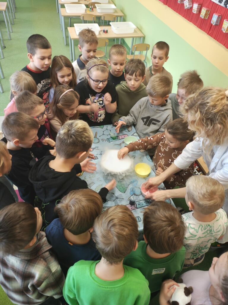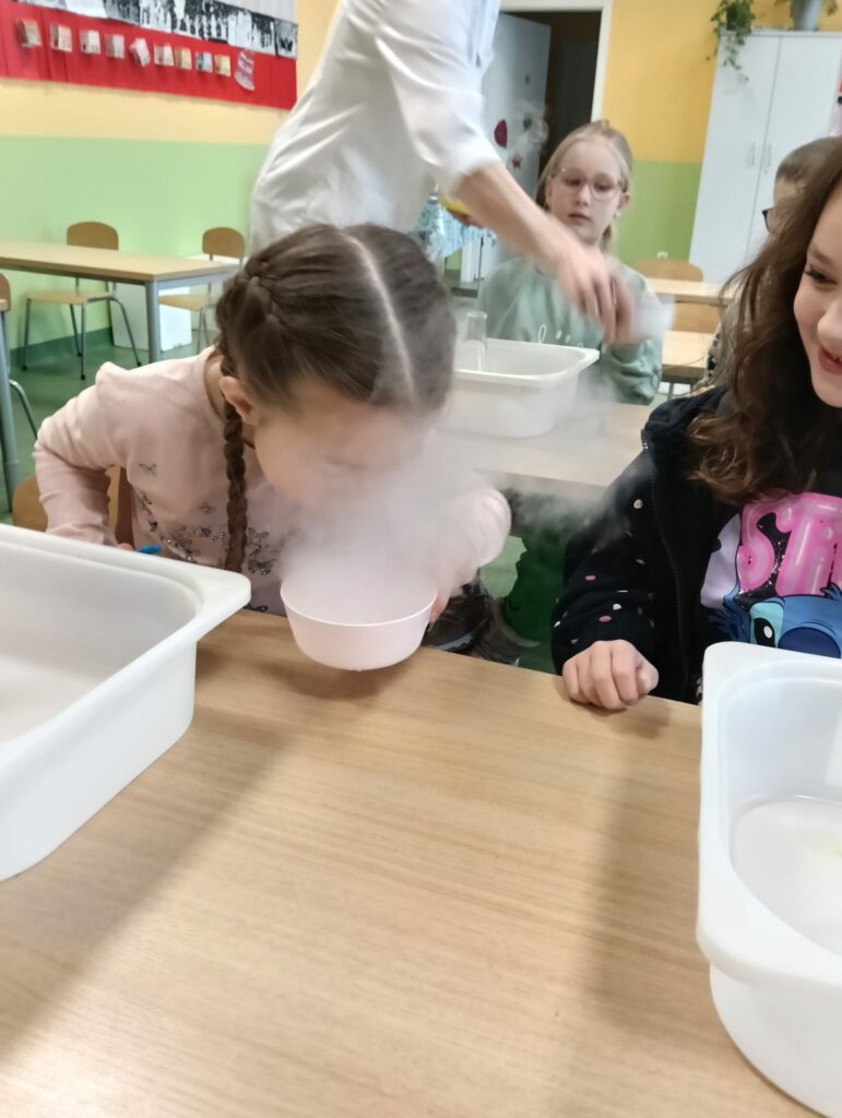Podczas kolejnych wspólnych zajęć klas pierwszych dzieci wzięły udział w niezwykle widowiskowych doświadczeniach z wykorzystaniem suchego lodu. Było dużo „dymu”, efektu wow i prawdziwego zachwytu 😍