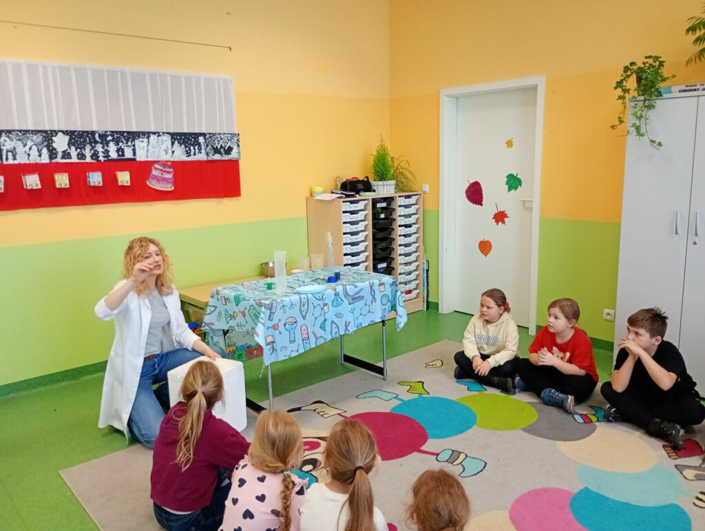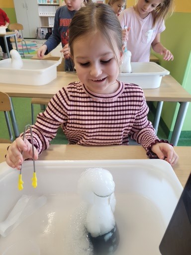 Uczniowie obserwowali, jak suchy lód zmienia swój stan, poznawali zasady bezpieczeństwa oraz z ogromnym zainteresowaniem śledzili przebieg eksperymentów. Zajęcia połączyły naukę z zabawą, rozbudzając ciekawość świata i chęć zadawania pytań ❄️