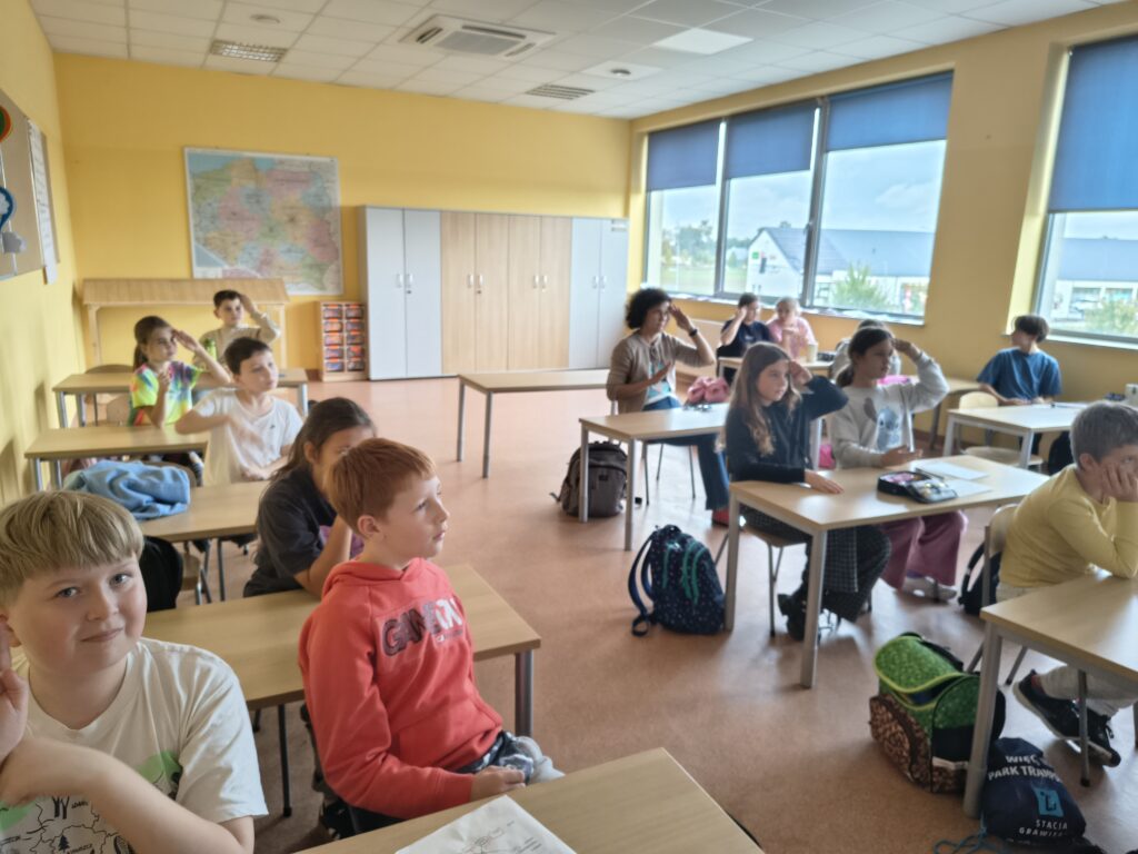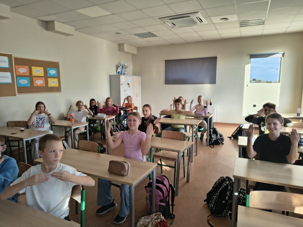 W ramach obchodów Międzynarodowego Dnia Głuchych i Języka Migowego odbyły się w październiku warsztaty dla uczniów klas 4, które przybliżyły dzieciom tematykę głuchoty, komunikacji niewerbalnej oraz języka migowego. Uczniowie poznali funkcjonowanie i znaczenie narządu słuchu, podstawowe pojęcia oraz sposoby porozumiewania się osób niedosłyszących i niesłyszących. Celem zajęć było zwrócenie uwagi uczniów na problemy osób głuchych, na ich prawa oraz trudności w codziennym życiu. W formie zabaw i ćwiczeń praktycznych dzieci poznały podstawowe zwroty polskiego języka migowego, oglądały bajkę i piosenkę w języku migowym.