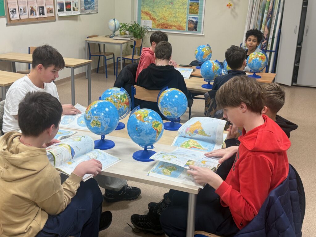 Na zajęciach kółka geograficznego 16 stycznia 2026 roku uczniowie rozwiązywali zagadki oraz quiz wiedzy o krainach geograficznych i państwach świata. Młodzież podróżowała palcem po mapie i globusie w poszukiwaniu: