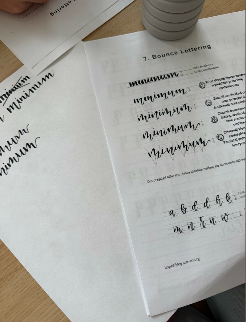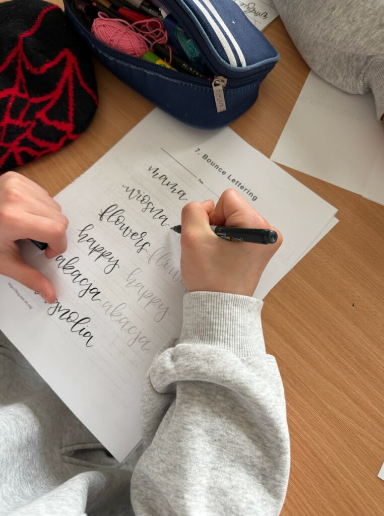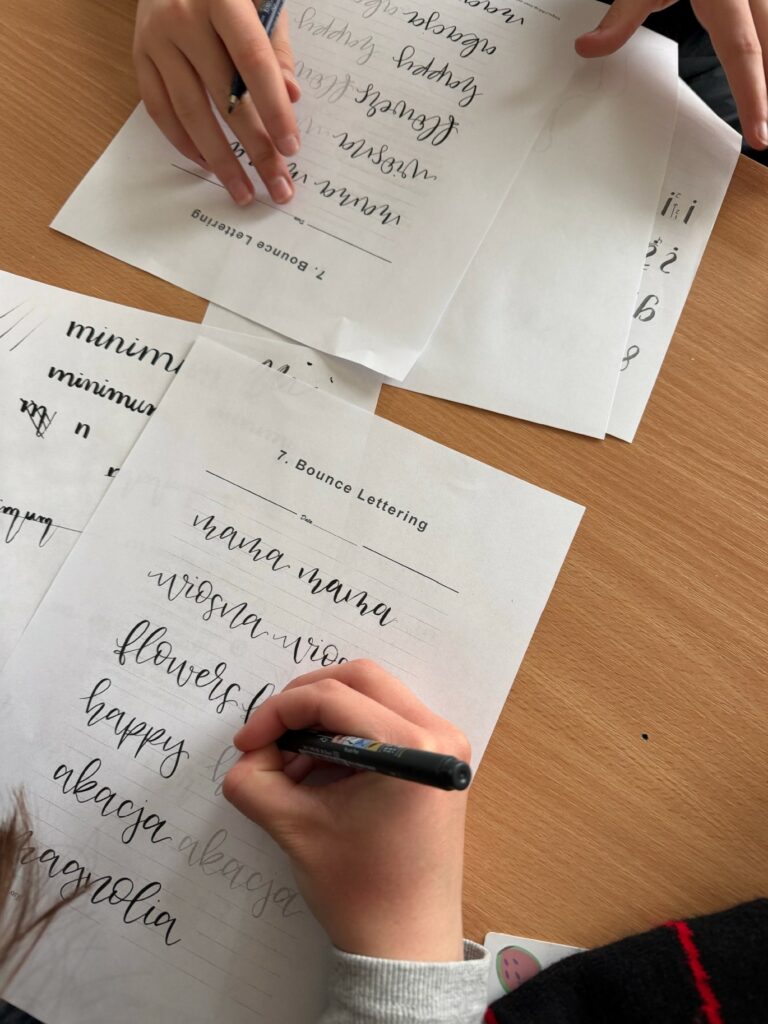 Nowością na zajęciach było poznanie techniki bounce lettering 🎨. To świetne ćwiczenie rozwijające swobodę pisania, poczucie rytmu oraz kreatywność. Uczniowie mogli eksperymentować z kształtem liter i bawić się ich układem, nadając napisom wyjątkowy charakter.