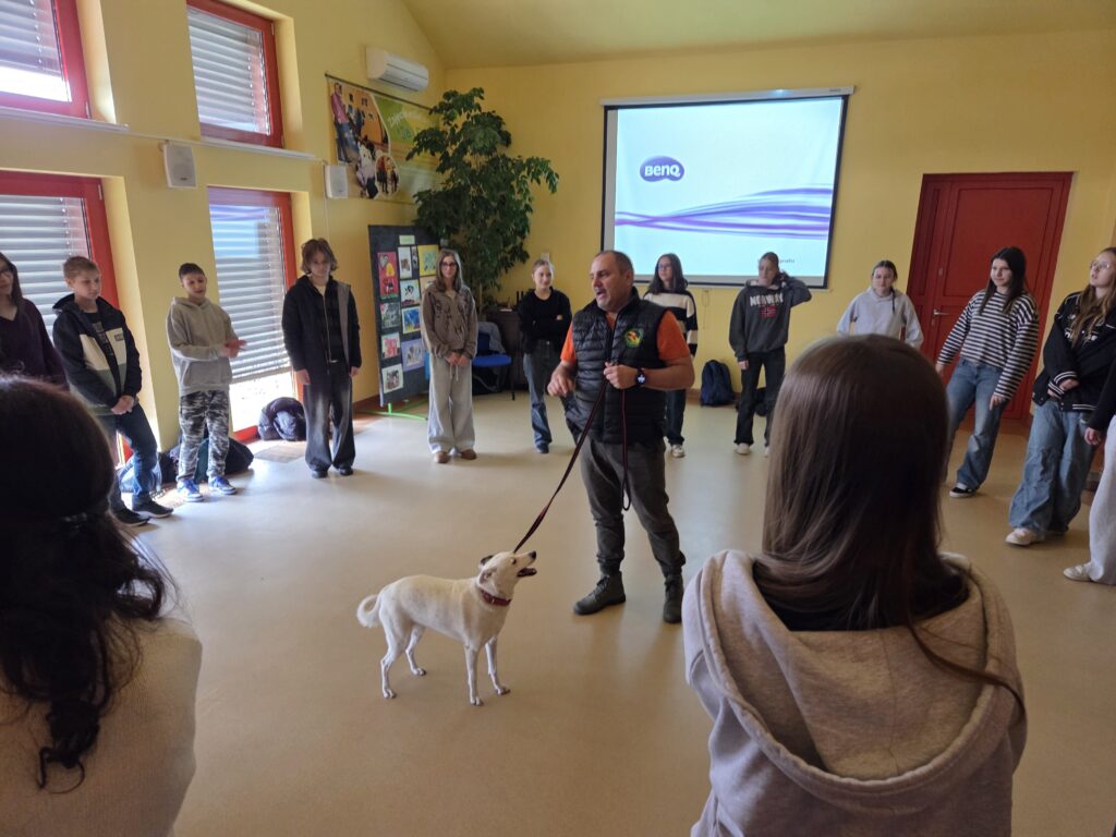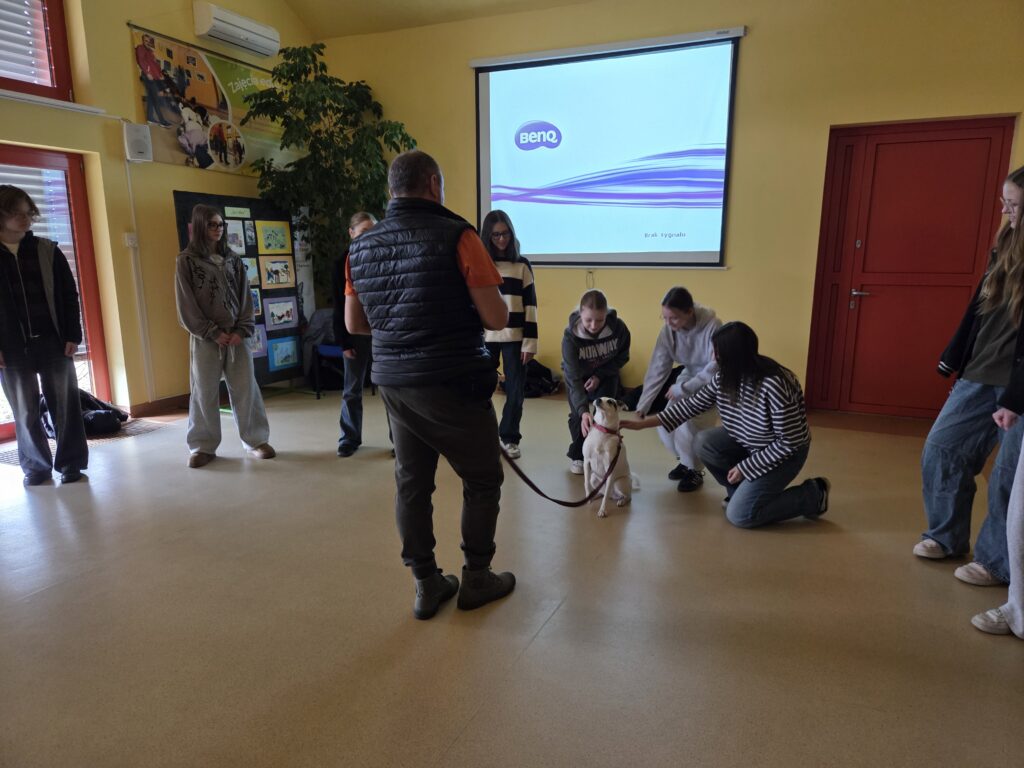 Podczas spotkania uczniowie mieli okazję zdobyć bardzo cenną wiedzę na temat właściwego zachowania wobec psów, zwłaszcza tych nieznanych. Prowadzący zajęcia w przystępny i ciekawy sposób wyjaśnił, jak bezpiecznie zbliżać się do psa oraz jakie sygnały wysyłane przez zwierzę mogą świadczyć o jego stresie lub niepokoju. Szczególną uwagę poświęcono sytuacjom, w których pies może ugryźć – uczniowie dowiedzieli się, że agresja zwierzęcia często wynika ze strachu, bólu lub potrzeby obrony swojego terytorium.