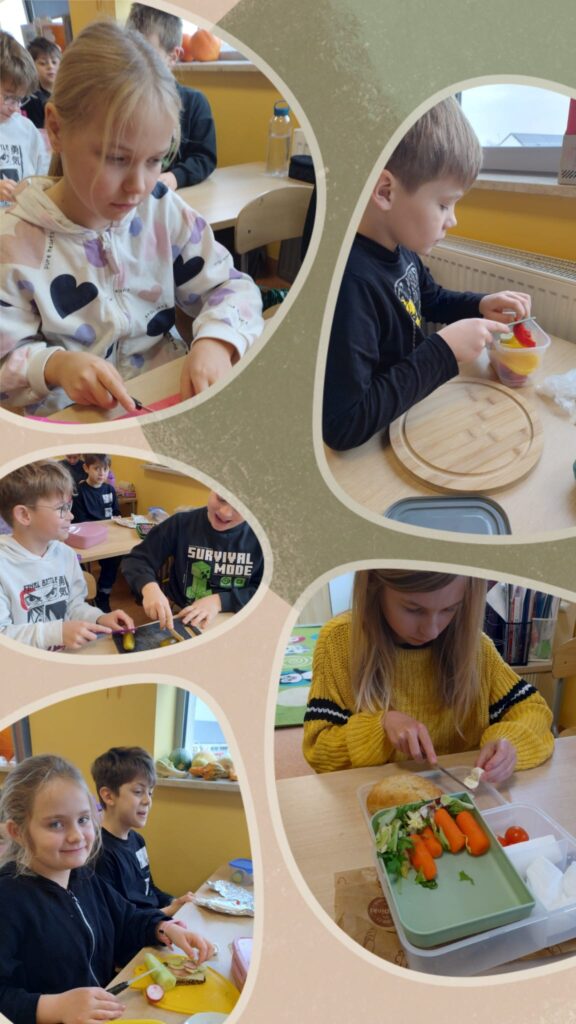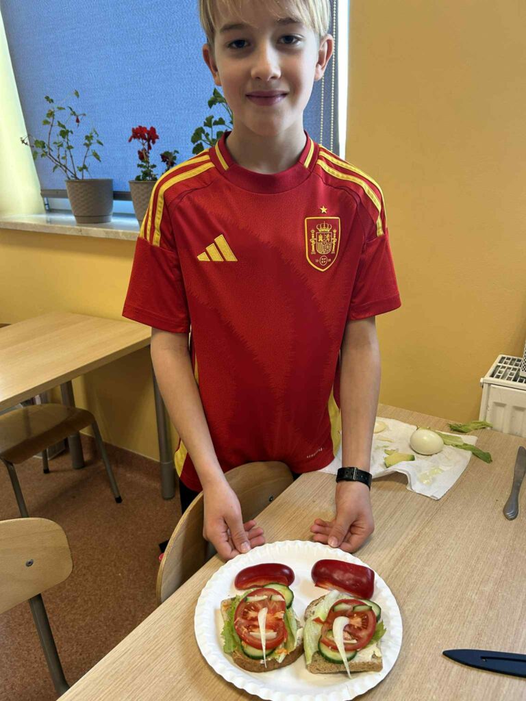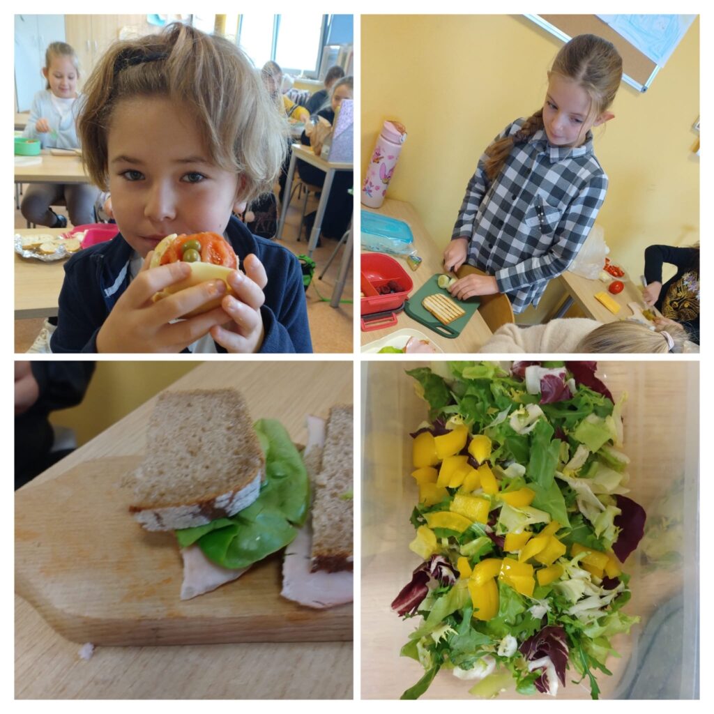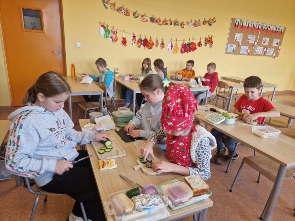 Klasy przygotowywały kolorowe kanapki, pełne warzyw, świeżego pieczywa i zdrowych dodatków. Tworzyły pyszne koktajle, blendując owoce, jogurty i naturalne składniki. Komponowały owocowe sałatki, ucząc się różnorodności smaków i wartości odżywczych.